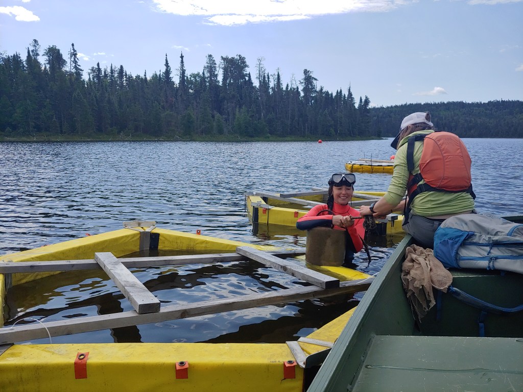 Littoral limnocorrals were used in 2022 to understand how microplastics interact with and impact the littoral (think shallow water) zone of a lake. This experiment also took place at the IISD-Experimental Lakes Area. We wanted to learn how microplastics impact the water, sediment and organisms living in littoral zones of a lake (benthic invertebrates, emergent insects and zooplankton). Littoral limnocorrals are 2 m in diameter and 1 m deep, secured to the sediment with sandbags to allow incorporation of sediment dwelling organisms. For this experiment we used the same mixture of microplastics (PE, PS, PET) as above, added in a range of concentrations using a regression design.