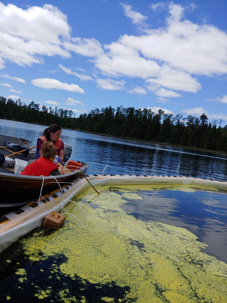 A limnocorral is a large enclosure or mesocosm that is self contained in a lake. Each limnocorral is essentially its own small ecosystem, which scientists can use to research the fate and effects of contaminants, such as microplastics. Using limnocorrals is a great way to learn more about environmentally-relevant fate and ecologically-relevant effects on populations and communities of organisms – which is difficult to study in a laboratory. These types of studies can help inform policy around ecological risk.