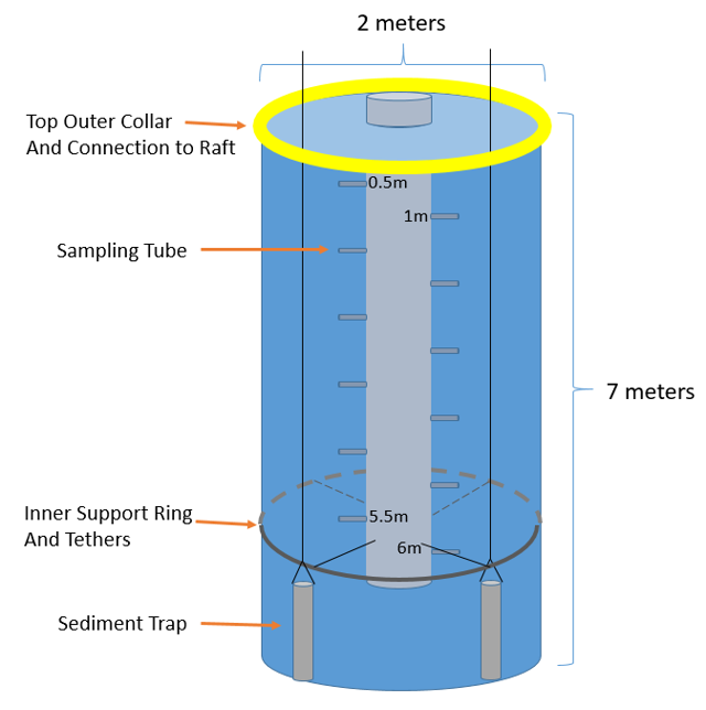 In 2021 we used a fate limnocorral to explore the vertical transport and distribution of microplastics in a lake. This research was conducted at Tait Preserve, a 70-acre lake on a former sand quarry in Penfield, NY. This experiment consisted of a single limnocorral that was 2 m in diameter and 7 m deep. The fate limnocorral was dosed with a mixture of PE, PS and PET microplastics, each type varying in colour and buoyancy to help trace the different plastics in the water column. A 6 m long sampling tube was used to sample microplastics in the water column at different depths, and sediment traps were used to collect sinking microplastics. The fate of the microplastics was monitored for 78 days.